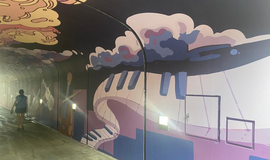 During the tunnel closure, I’d read that a mural would be going up. I saw it now: piano keyboards, violins, and instruments of all kinds danced the length of the tunnel walls. These five young artists must have had detail work to finish up, for they laughed with one another as they dabbed their brushes at the wall. They acted so engrossed with their project and with each other that I wondered if they even noticed the cyclists flying by so close behind them. I watched them enjoying this new thing they were doing, and I let their smiles make me smile, too.